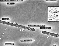 Paul Doumer Bridge, 11 Aug 1967, after it was bombed for the first time. This photograph, taken from aircraft commanded by Lieut. Cols Hotchkiss & Place (see "How They Brought the Good News from Ghent to Aix" in Alone, Unarmed and Unafraid) was forwarded to President Johnson, et al., and confirmed the bombers (F-105s) had done their job. (Photo credit: U.S. Air Force; Wikipedia.)(For unknown reasons photo interpreters inserted the date 12 August 1967 in the picture .)