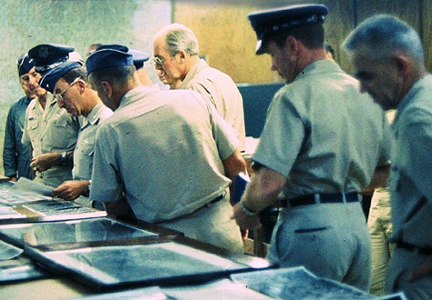Jimmy Stewart, a brigadier general in the U.S. Air Force Reserve, visits Udorn in this undated photograph taken in the squadron flight planning room. There are several quiet statements being made: the one star is standing between Stewart and the (presumably) photographs of previous successes; only one flight crew member—well, a flight suit—is in the picture; the grey-haired guy on the far right appears to wish all this was over. According to the officer’s club serving staff, Stewart drank whiskey sours; this is not verified. (Photo credit: library of Don Cowdrey; used by permission.)