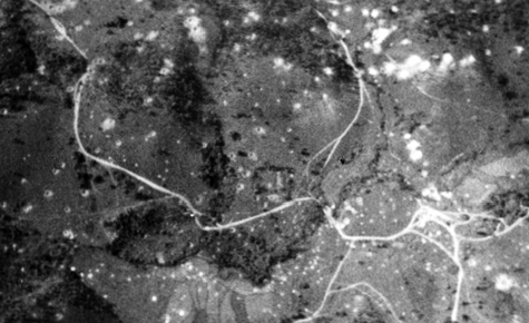 The A7-71 split. The location is not certain; that said, the location is Laos, possibly southern Laos. The legend on flying maps coded these as all-weather roads. The bomb craters—they appear as scars—are good indicators Air Force target planners considered the roads, especially because of the intersection, worthy targets. By 1970, aircraft, even while bombing, were prohibited from flying below 4,000 feet above ground level while in harm’s way; no target was considered of sufficient value to merit even the possible loss of an aircraft and the maximum range of small arms fire was about 4,000 feet. In context, a .22 caliber rifle would be considered small arms. (Photo credit: library of Dick Hammaker; used by permission.)