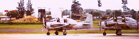 Three T-28 Trojans taxi at Udorn. The lead plane has a Royal Lao Air Force marking on the fuselage. These insignia could be mixed, matched or eliminated—and routinely were—to display the desired insignia for the day’s mission (more: “Colonel Wing Commander” in Alone, Unarmed and Unafraid). (Photo credit: library of Dick Hammaker; used by permission.)